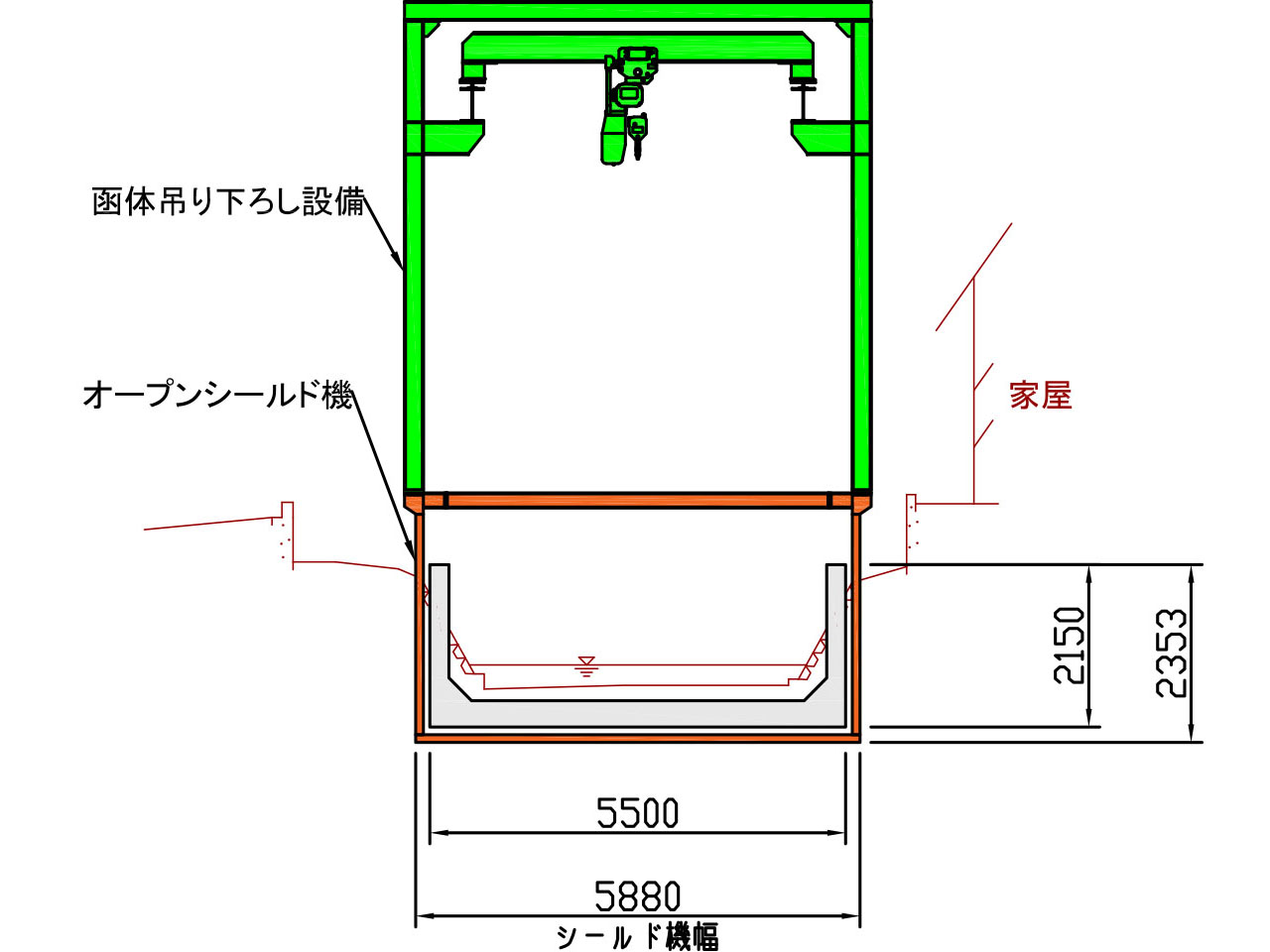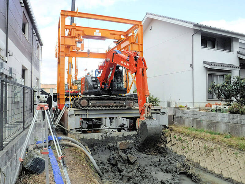 | 施工概要 | 家屋が両側に近接した石積水路敷地内での改修工事です。クレーン等の重機が入れないため、オープンシールド機にバックホウと函体吊り下ろし設備を搭載して施工しました。 |
